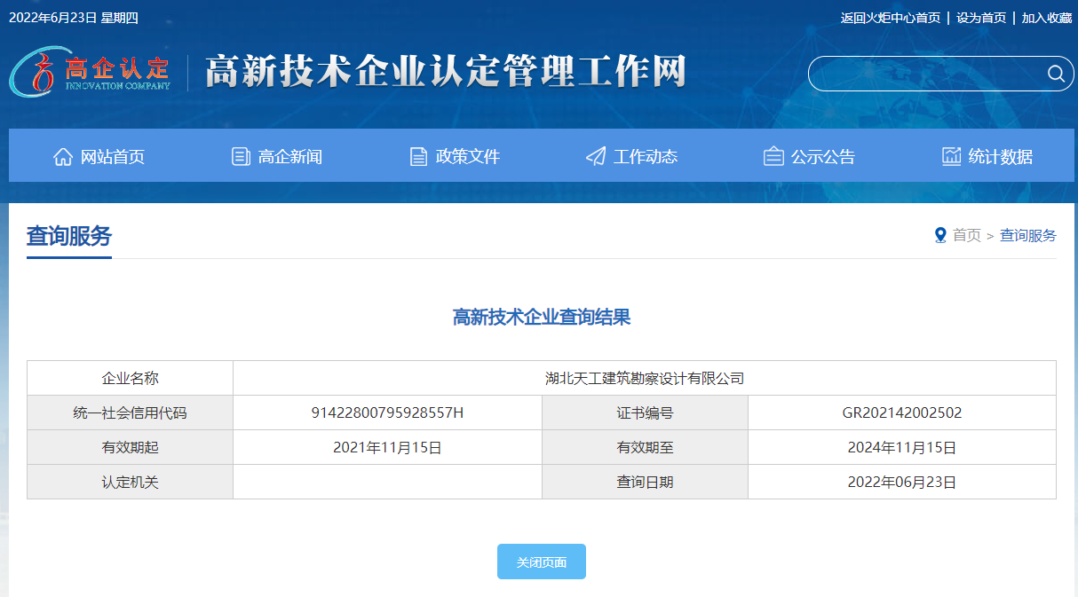 根據《高新技術企業認定管理辦法》(國科發火〔2016〕32號)和《高新技術企業認定管理工作指引》(國科發火〔2016〕195號)有關規定,湖北省公示了認定高新技術企業名單,湖北天工建筑勘察設計有限公司(以下簡稱“天工設計”)榜上有名,榮膺“國家高新技術企業”。
