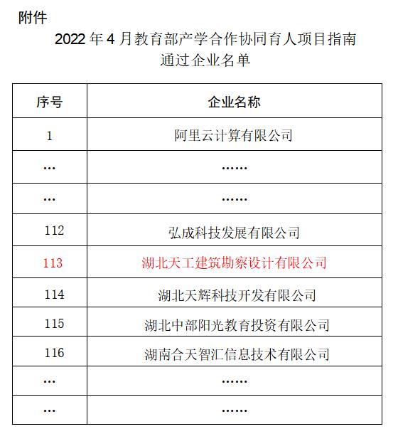 教育部產學合作協同育人項目專家組于2022年5月11日發布教產?!?022〕3 號文《關于公布教育部產學合作協同育人項目指南通過企業名單(2022 年 4 月)的通知》中,序號113(詳后截圖),湖北天工建筑勘察設計有限公司榮譽上榜。