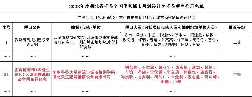 2023年11月30日,湖北省城市規劃協會公示了2023年度湖北省推薦全國優秀城市規劃設計獎推薦項目名單,湖北天工建筑勘察設計有限公司聯合華中科技大學完成的“江夏區南部(農業生態區)區域發展戰略及空間布局研究”項目榮獲二等獎,并計劃申報國家級獎項!(撰稿人:李媛)